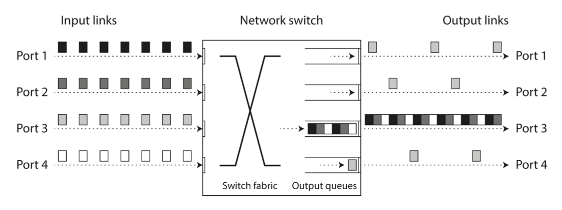 - several nodes simultaneously sending packets to a single destination. On a busy network link, a packet may have to wait until it can't get a slot (network congestion). queue is full -> packet is dropped, and retransmission is required.